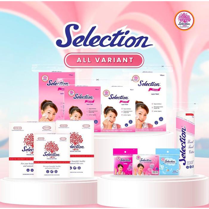 | Selection Round Facial Cotton (BEST SELLER) | Bulat, tekstur bertekstur | Membersihkan wajah, menghapus makeup, aplikasi skincare | 80 lembar per rol |
