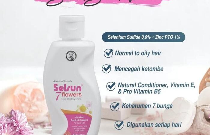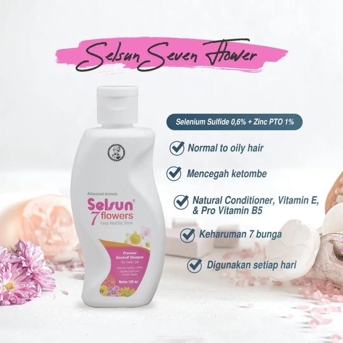 Selsun 7 Flowers ShampooPerawatan Menyeluruh. Memberikan keharuman 7 bunga, membuat rambut sehat, lembut, dan berkilau.Selenium Sulfide & ZnPtO (antiketombe), Vitamin E & Pro-Vitamin B5 (nutrisi). Double Conditioner untuk kelembutan.