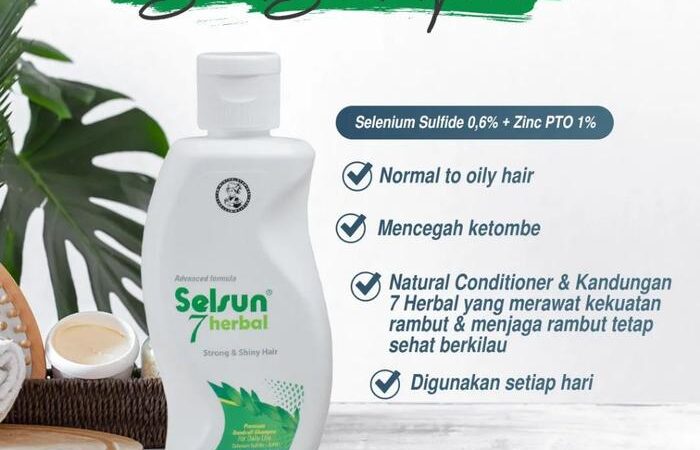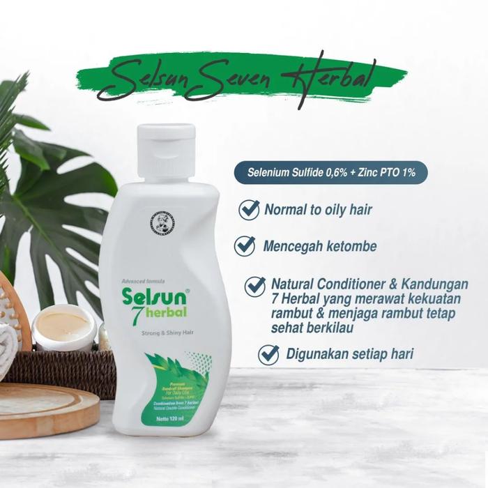 Selsun 7 Herbal ShampooPerawatan Alami. Mengurangi kerontokan, memperkuat, dan membuat rambut berkilau secara alami.Selenium Sulfide & ZnPtO (antiketombe). Ekstrak Soya, Gandum, Sophora Japonica, Ginseng (menguatkan). Kemiri Oil, Urang Aring, Sweet Almond Oil (kilau).