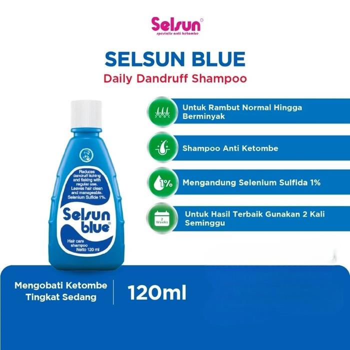 Selsun Blue ShampooKetombe Ringan-Sedang. Menghilangkan ketombe & mengurangi rasa gatal pada kulit kepala.Selenium Sulfide. Gunakan 2x seminggu, lanjutkan dengan Selsun Blue 5/Gold untuk perawatan harian.