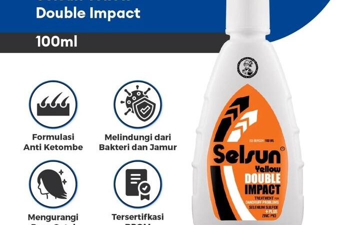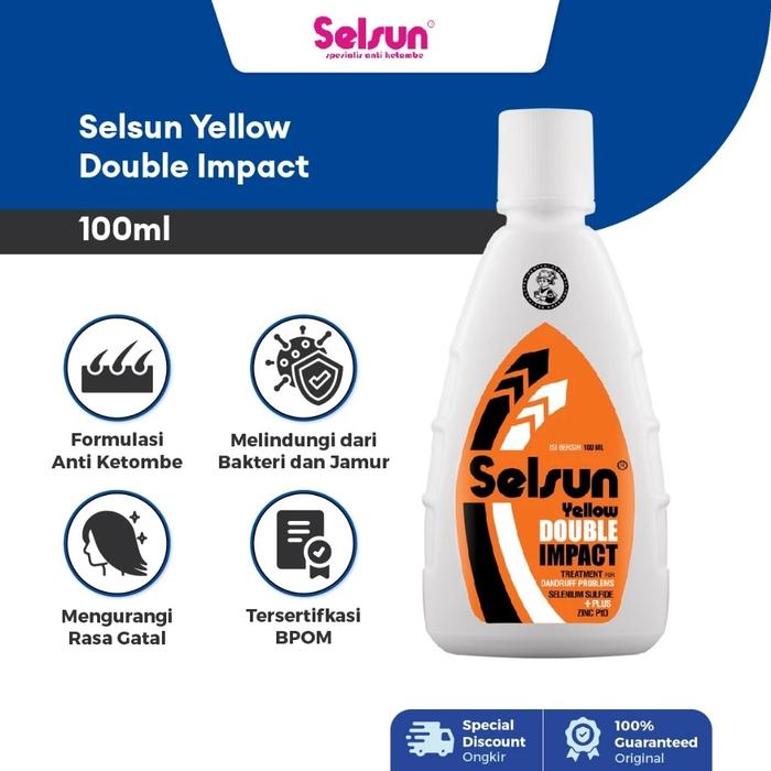 Selsun Yellow Double ImpactKetombe Berat. Kombinasi ganda efektif mengatasi ketombe membandel dan gatal berlebih.Selenium Sulfide & Zinc Pyrithione (ZnPtO). Gunakan 2x seminggu, lanjutkan dengan Selsun Blue 5/Gold untuk perawatan harian.