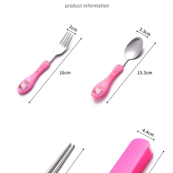 Dibuat dari material Stainless Steel berkualitas tinggi yang anti karat, tahan lama, dan sangat mudah dibersihkan. Setiap peralatan memiliki ujung yang tumpul sehingga sangat aman untuk mulut anak. Dilengkapi kotak plastik transparan yang memudahkan penyimpanan dan menjaga kebersihan peralatan, ideal untuk dibawa ke sekolah atau dalam perjalanan.