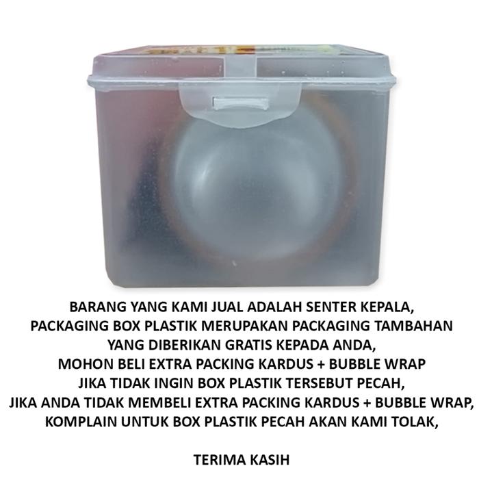 Setiap pembelian sudah termasuk Kabel Charger, Adaptor, Tali Kepala, dan dikemas dalam Box Mika. Tersedia pilihan cahaya putih dan kuning.