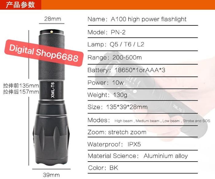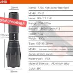 Temukan senter taktis paling andal untuk segala kondisi. Senter LED super terang ini memancarkan cahaya hingga 8000 lumens, menerangi kegelapan dengan jangkauan yang luas. Dibekali lampu LED CREE XML-T6 berkualitas tinggi dan dilengkapi dengan baterai 18650 serta charger-nya, membuatnya siap pakai right out of the box.