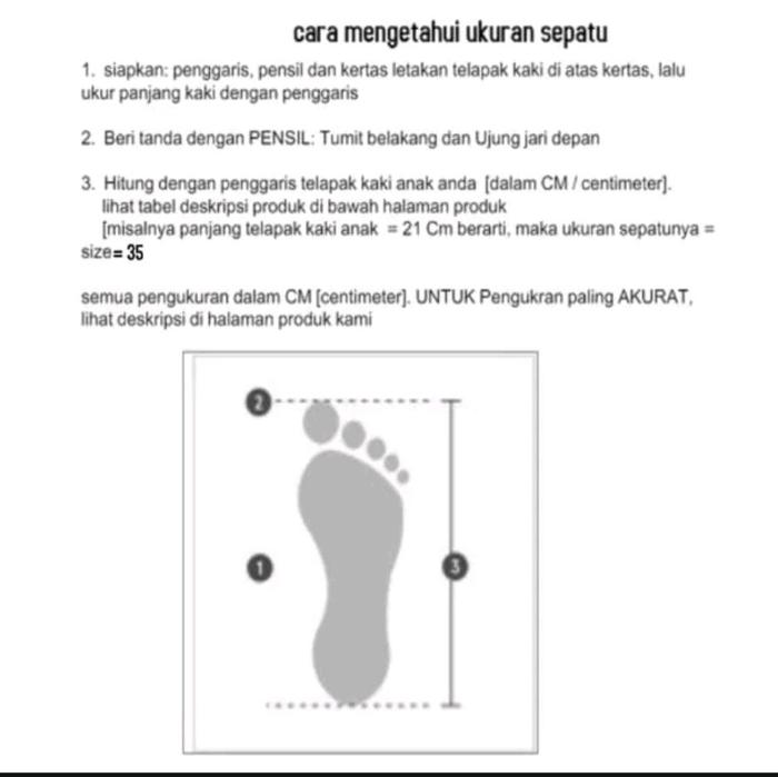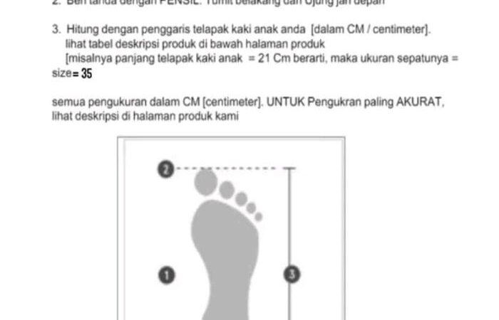 PENTING: Tabel usia hanya perkiraan. Ukuran kaki setiap anak berbeda-beda. Sangat disarankan untuk mengukur panjang kaki anak terlebih dahulu sebelum memesan untuk mendapatkan ukuran yang paling pas. Konsultasikan ukuran dengan admin kami yang siap membantu.
