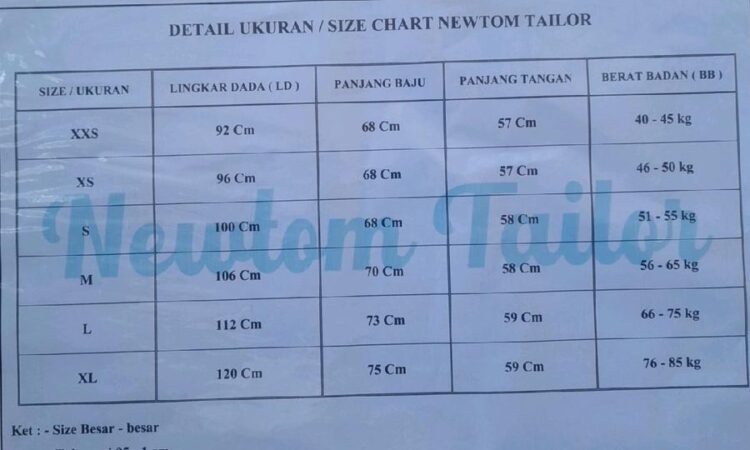 | Ukuran | XXS–XL (lihat tabel) Size Chart: – XXS: Lingkar dada 92 cm, Panjang baju 66 cm – XS: 96 cm/68 cm – S: 100 cm/68 cm – M: 106 cm/70 cm – L: 112 cm/73 cm – XL: 120 cm/75 cm |
