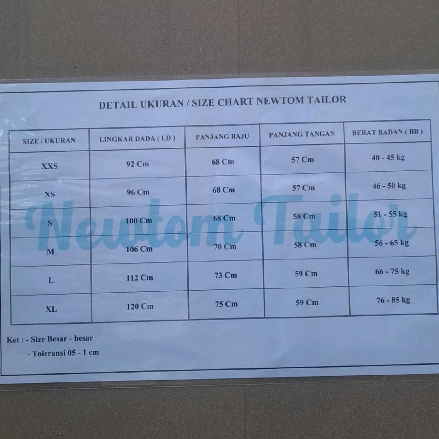 | Ukuran | XXS–XL (lihat tabel) Size Chart: – XXS: Lingkar dada 92 cm, Panjang baju 66 cm – XS: 96 cm/68 cm – S: 100 cm/68 cm – M: 106 cm/70 cm – L: 112 cm/73 cm – XL: 120 cm/75 cm |