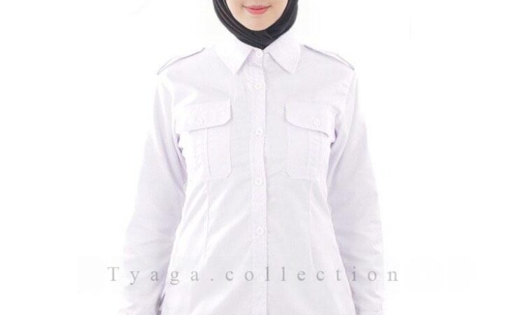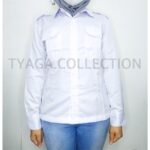 | Model | Slim fit, lengan panjang, saku dua, kemeja wanita |