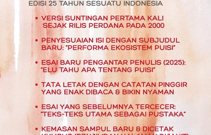 Edisi peringatan 25 tahun ini menghadirkan “Teks-teks Utama sebagai Pustaka” yang sebelumnya tercecer. Afrizal Malna, melalui buku ini, mengajak kita merumuskan Indonesia lewat puisi—sebuah warisan historis yang membawa sastra kembali ke tengah masyarakat.