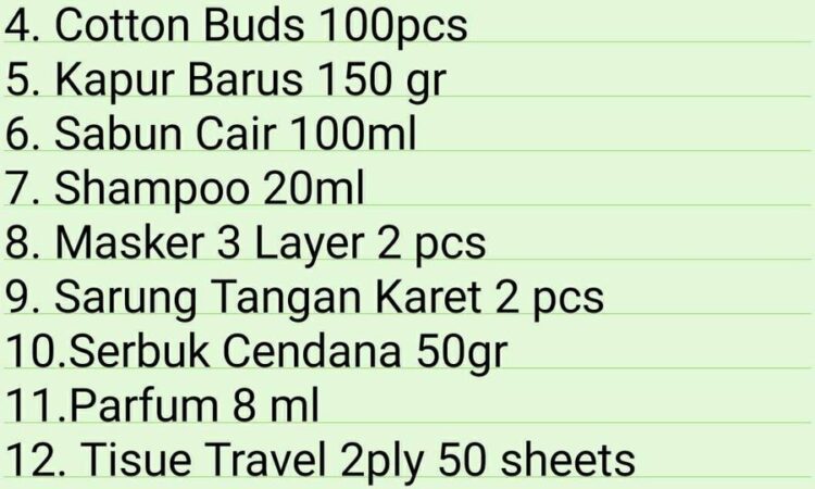 | Perlengkapan Tambahan | Gunting, bendera kuning, spon mandi, tisue travel, celemek plastik, dus polos (39x26x24 cm) |