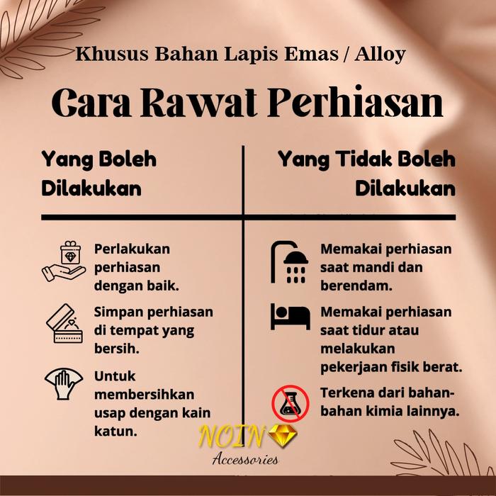 - Perawatan: Hindari kontak dengan keringat, parfum, hair spray, aseton, kosmetik, kolam renang, atau deterjen. Lepas saat melakukan aktivitas rumah tangga atau pekerjaan berat.