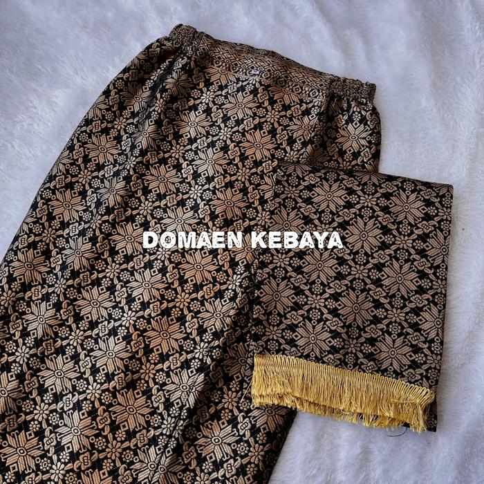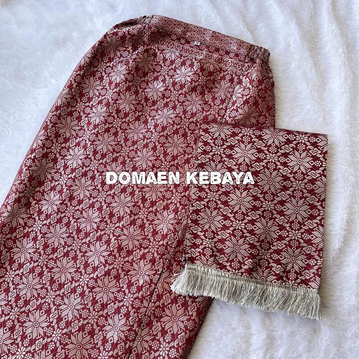 Rok siap pakai yang terbuat dari kain songket asli, bukan katun batik biasa. Kainnya memiliki tekstur motif yang timbul dan terasa sedikit kaku karena ditenun dengan benang emas atau perak, bukan hasil sablon atau printing. Desainnya praktis dengan resleting di bagian belakang yang dilengkapi kancing pengait untuk keamanan. Pada sisi kiri dan kanan pinggang terdapat karet untuk kenyamanan dan kelonggaran. Rok didesain simpel tanpa furing dan tanpa saku untuk menjaga kesan elegan dan kemurnian tampilan kain songket.