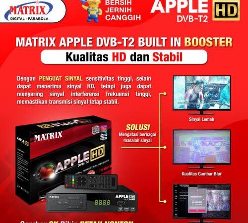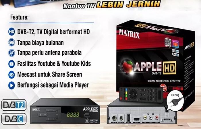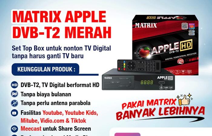 Tingkatkan pengalaman menonton TV Anda dengan STB Matrix Apple DVB-T2 HD berwarna merah. Receiver ini menawarkan fitur paling lengkap di kelasnya untuk menerima siaran TV digital gratis dengan kualitas terbaik.