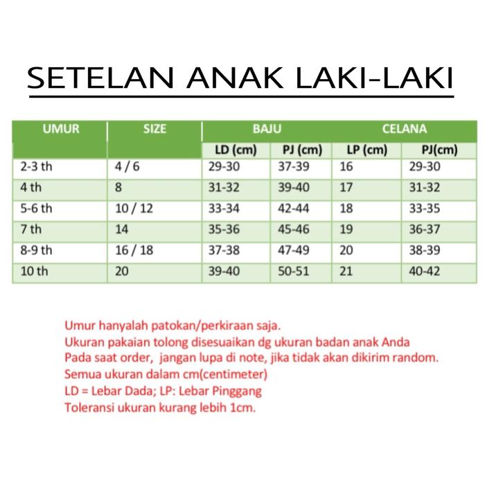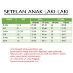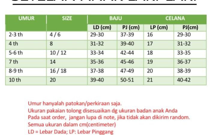 | Size (Usia) | Baju – Lebar Dada (LD) / Panjang (Pjg) | Celana – Lingkar Pinggang (LP) / Panjang (Pjg) |