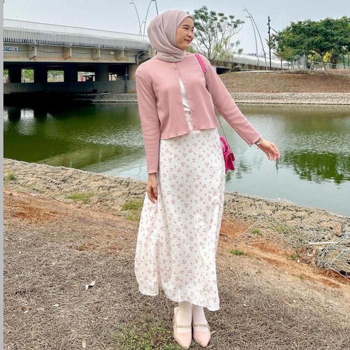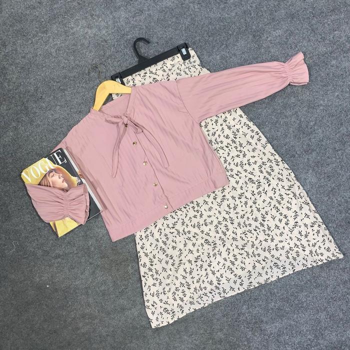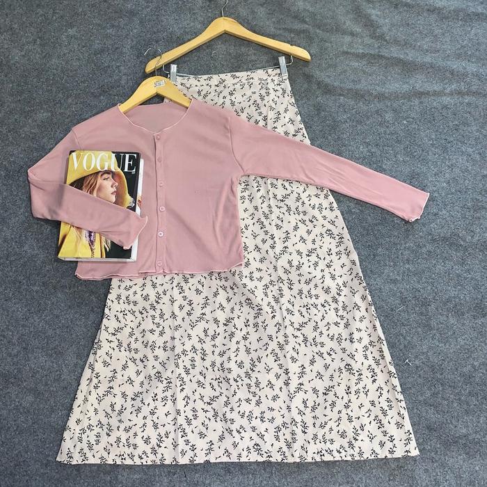 | Desain | Cardigan crop pendek + rok motif high-waist, cocok untuk mix & match |
