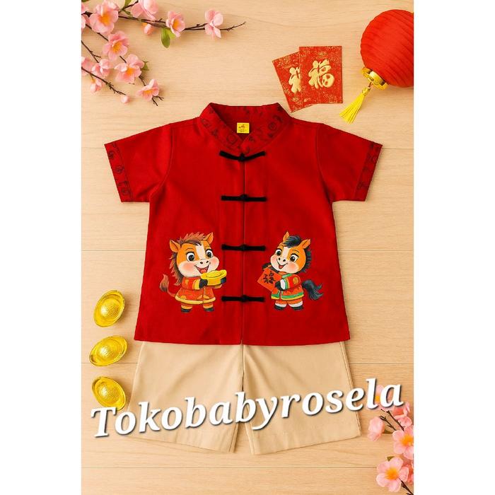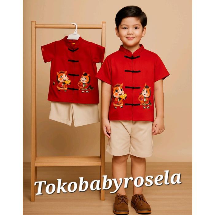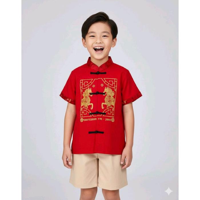 Dibuat dari katun premium pilihan yang sangat lembut, menyerap keringat dengan baik, dan terjamin tidak menyebabkan panas atau gatal pada kulit anak. Setelan ini terdiri atas atasan bergaya Cheongsam dengan kancing frog dan celana panjang ¾ dengan pinggang karet untuk kenyamanan maksimal. Warna celana cream yang dipadukan dengan atasan merah cerah menciptakan kombinasi yang klasik dan elegan.