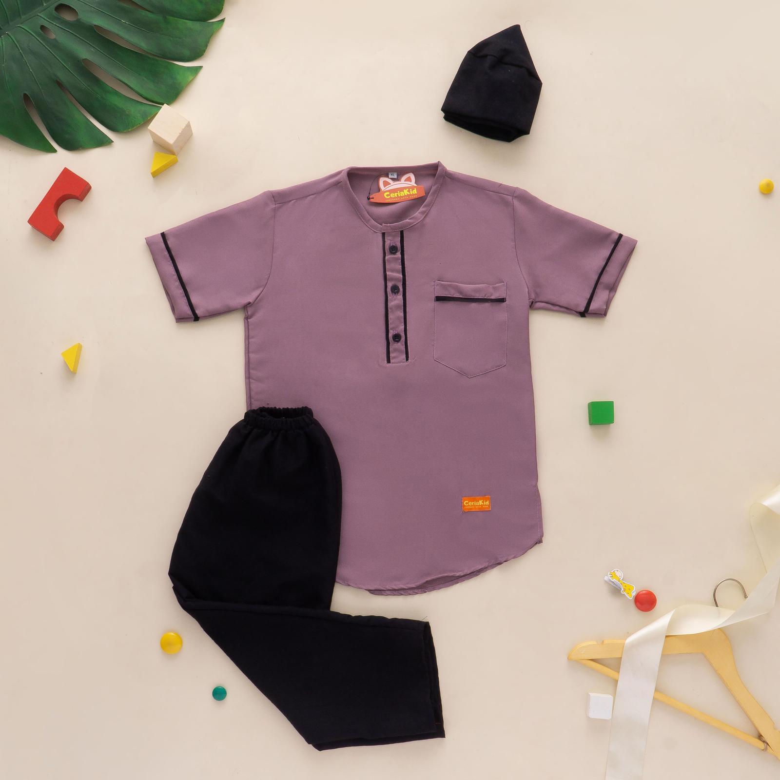 Dibuat dari bahan Polyester Microsoft pilihan yang terkenal super halus, lembut, dan sangat nyaman dipakai seharian. Desainnya minimalis namun elegan, memberikan tampilan yang rapi dan classy. Setelan lengkap ini terdiri atas baju koko, celana panjang, dan peci yang serasi.