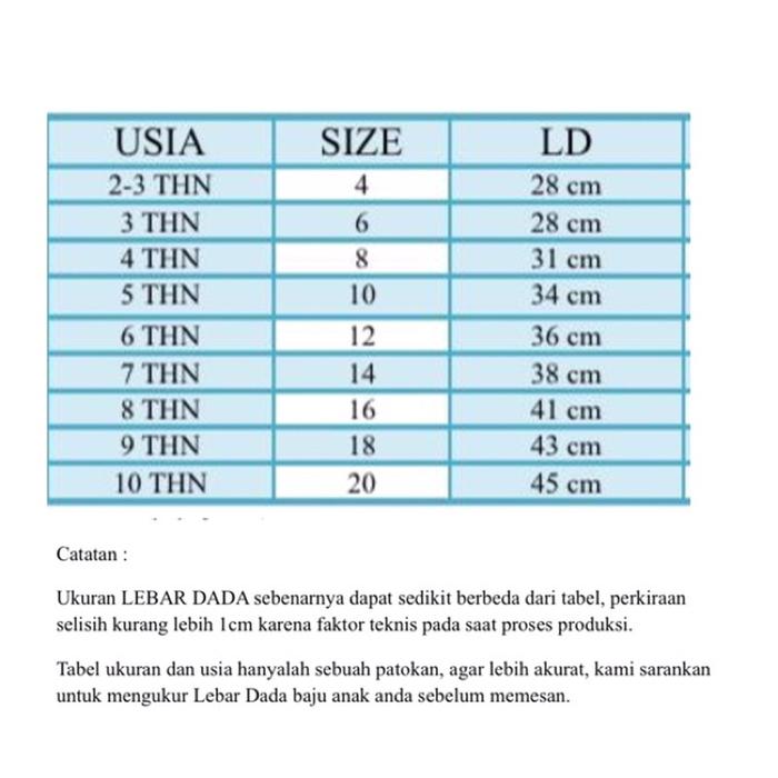 | Ukuran (Berdasarkan Usia) | Size (Biasa) | Lebar Dada (cm) | Lingkar Badan (cm) |