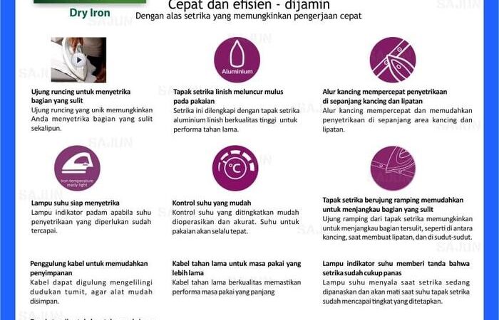 - Thermostat: Pengatur suhu otomatis yang menjaga setrika tetap pada temperatur yang dipilih, mencegah overheating dan menjaga keamanan.