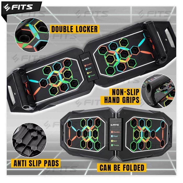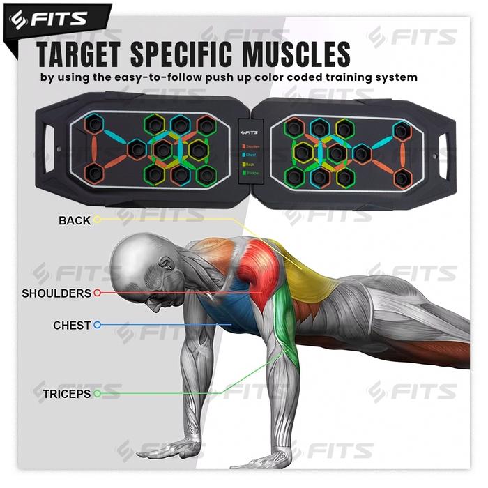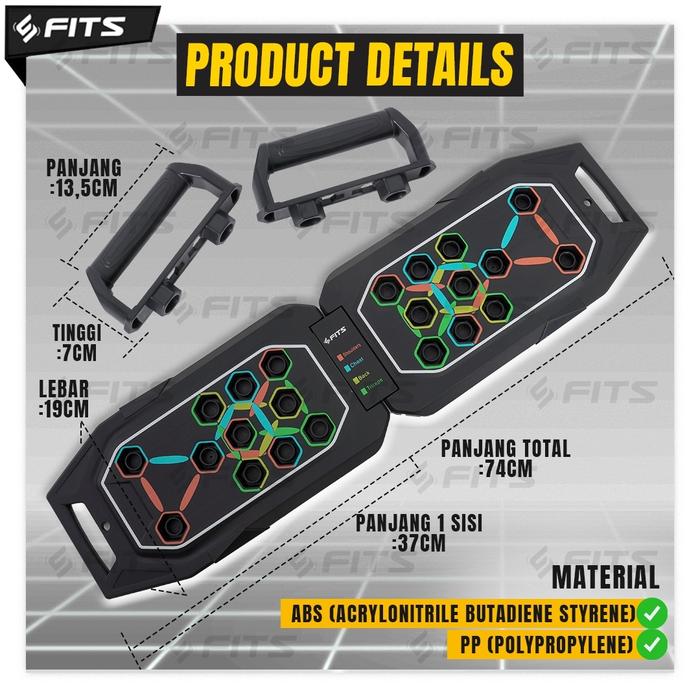 Dilengkapi dengan 12 posisi push up berkode warna yang berbeda untuk menargetkan kelompok otot spesifik: trisep, dada (back), bahu (shoulder), dan latissimus dorsi. Setiap posisi memberikan intensitas dan fokus latihan yang berbeda.