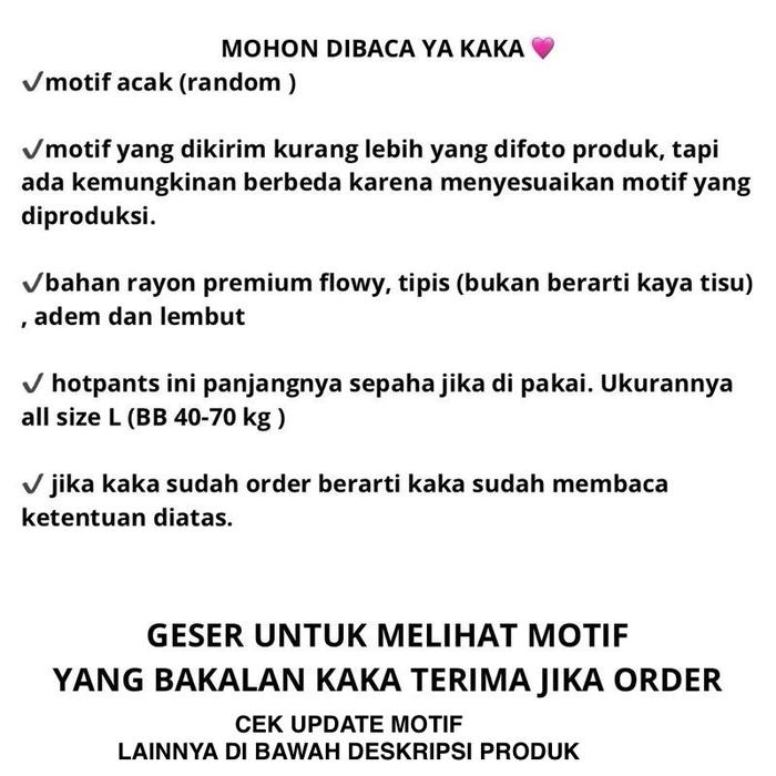 Tampil percaya diri dan nyaman sepanjang hari dengan Shortpants Rayon Premium kami. Dirancang khusus untuk wanita modern, celana pendek ini tidak hanya menawarkan gaya yang stylish dengan motif viral terkini tetapi juga kenyamanan tak tertandingi. Bahan rayon premium pilihan menjamin kelembutan dan sirkulasi udara yang optimal, membuatnya adem dan tidak gerah meski dipakai dalam waktu lama. Dengan model all size L yang fleksibel, shortpants ini cocok untuk berat badan 40-70 kg, menjadikannya pilihan yang tepat untuk berbagai bentuk tubuh.
