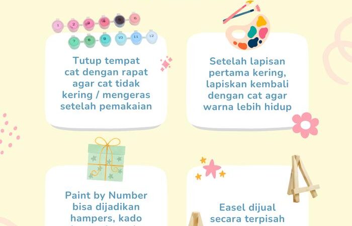 - Paint-by-number: Teknik melukis dengan mengisi area bernomor menggunakan cat sesuai panduan warna. Cocok untuk pemula.