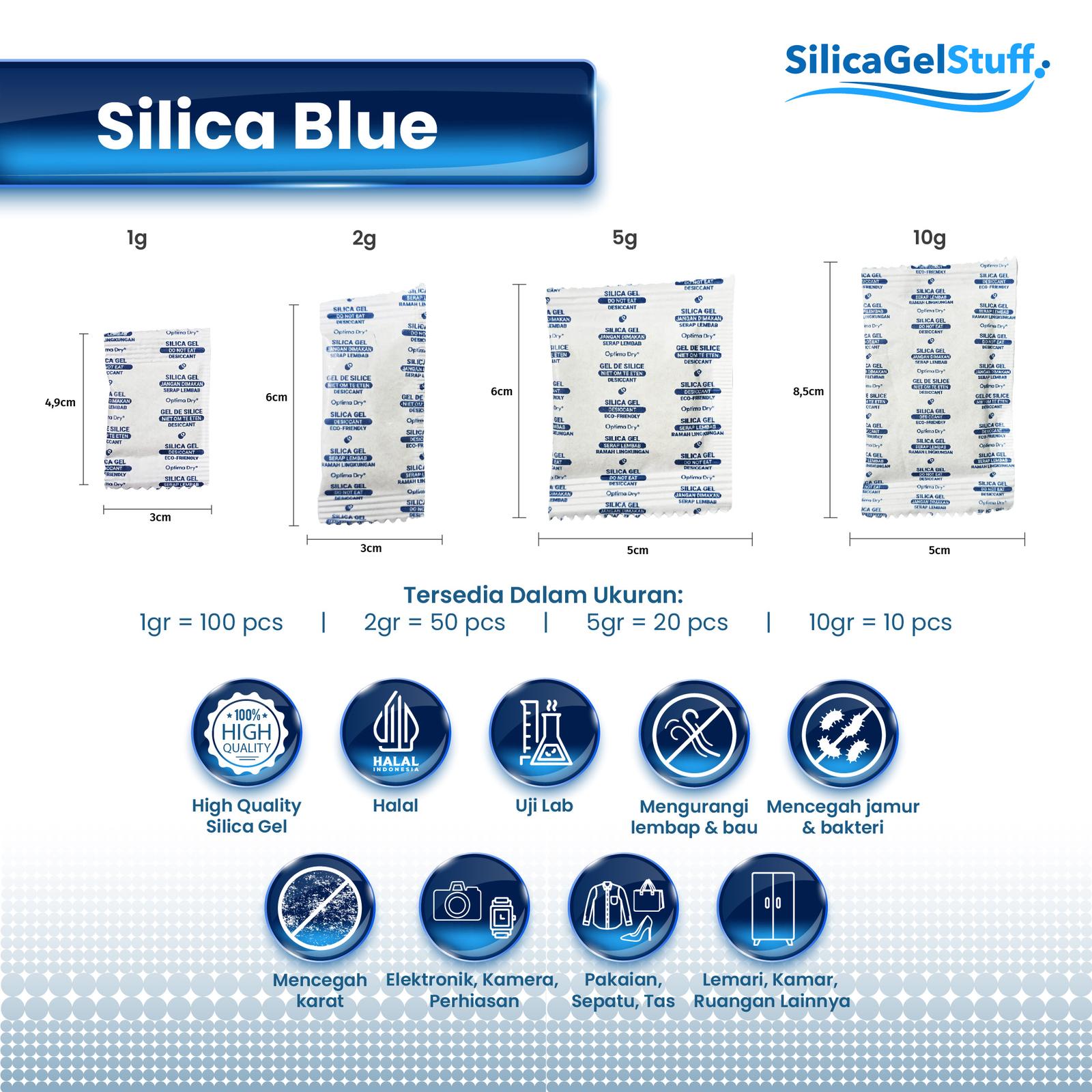 Lindungi barang berharga Anda dari kelembapan dengan Silica Gel Biru Grade A. Desiccant ini sangat efektif menyerap uap air di udara, mencegah timbulnya jamur, bau apek, kerusakan, dan korosi pada berbagai benda. Cocok untuk digunakan di lemari pakaian, kotak sepatu, kotak dokumentasi, tas, brankas, kabinet elektronik, dan kotak penyimpanan apa pun.