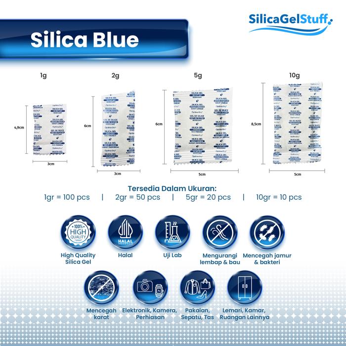 Silica Gel Blue mengandung cobalt chloride sebagai indikator kelembapan. Saat menyerap air, warnanya berubah dari biru menjadi merah muda (pink), lalu putih, menandakan sudah jenuh dan perlu diganti atau diaktifkan kembali.