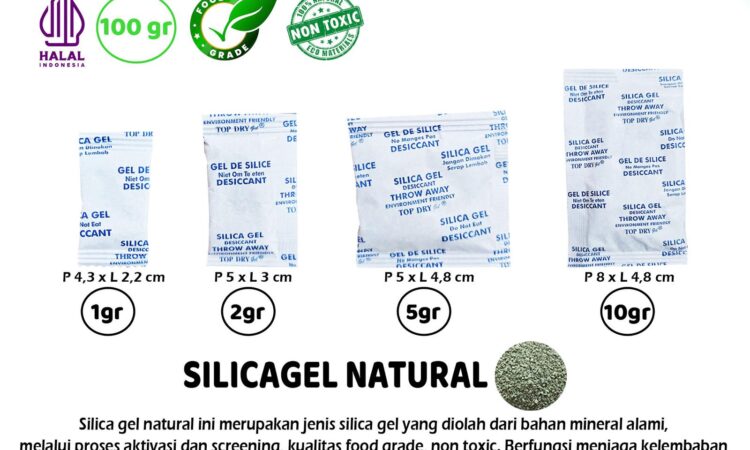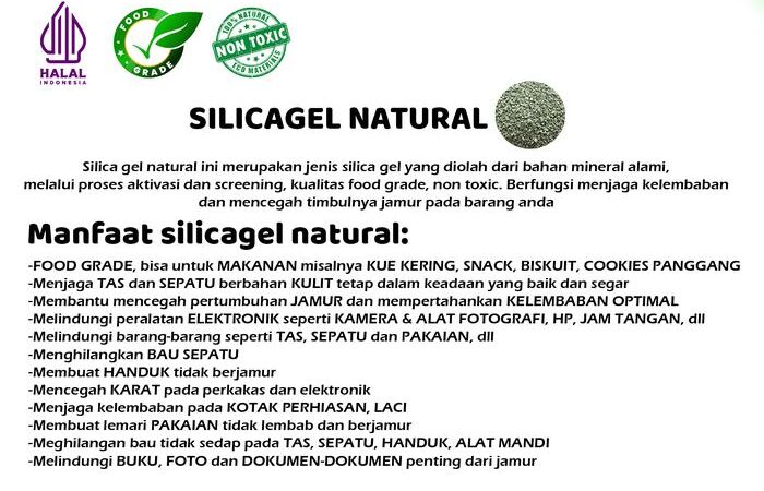 Produk silica gel alami kami terbuat dari 100% bahan mineral food grade yang aman dan sangat efektif menyerap kelembaban berlebih. Cocok digunakan untuk melindungi berbagai barang berharga Anda dari jamur, bau tak sedap, dan kerusakan akibat udara lembap.