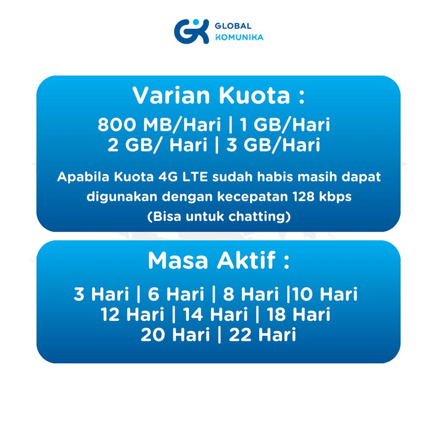 | – FUP: 800MB/hari, 1GB/hari, atau 2GB/hari. Kecepatan turun ke 128 kbps jika melebihi FUP. Kembali normal keesokan hari. | |