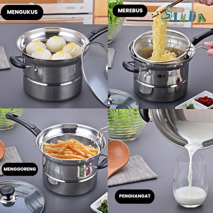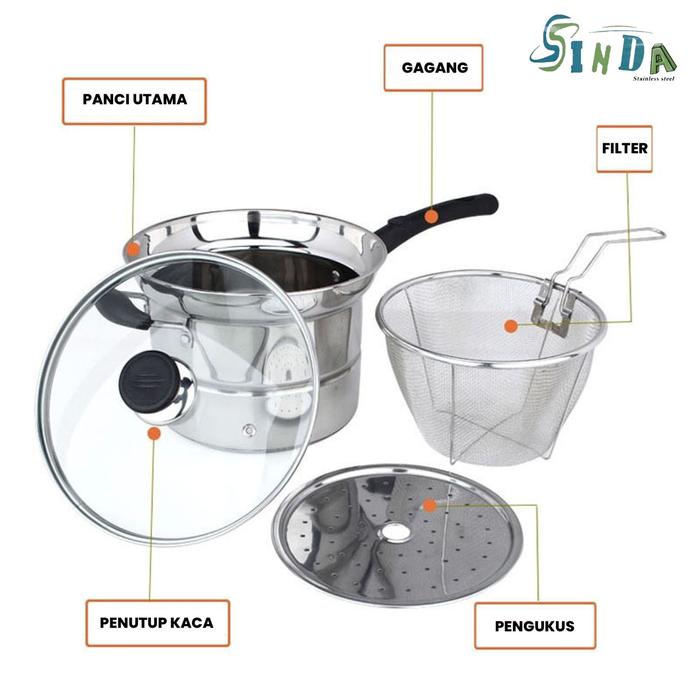 Wujudkan kreasi masakan terbaik Anda dengan satu alat praktis! Panci multifungsi Sinda menghadirkan solusi lengkap untuk memasak sehari-hari. Dengan desain 3-in-1, Anda dapat menggoreng, mengukus, dan merebus hanya dalam satu panci berkualitas tinggi.