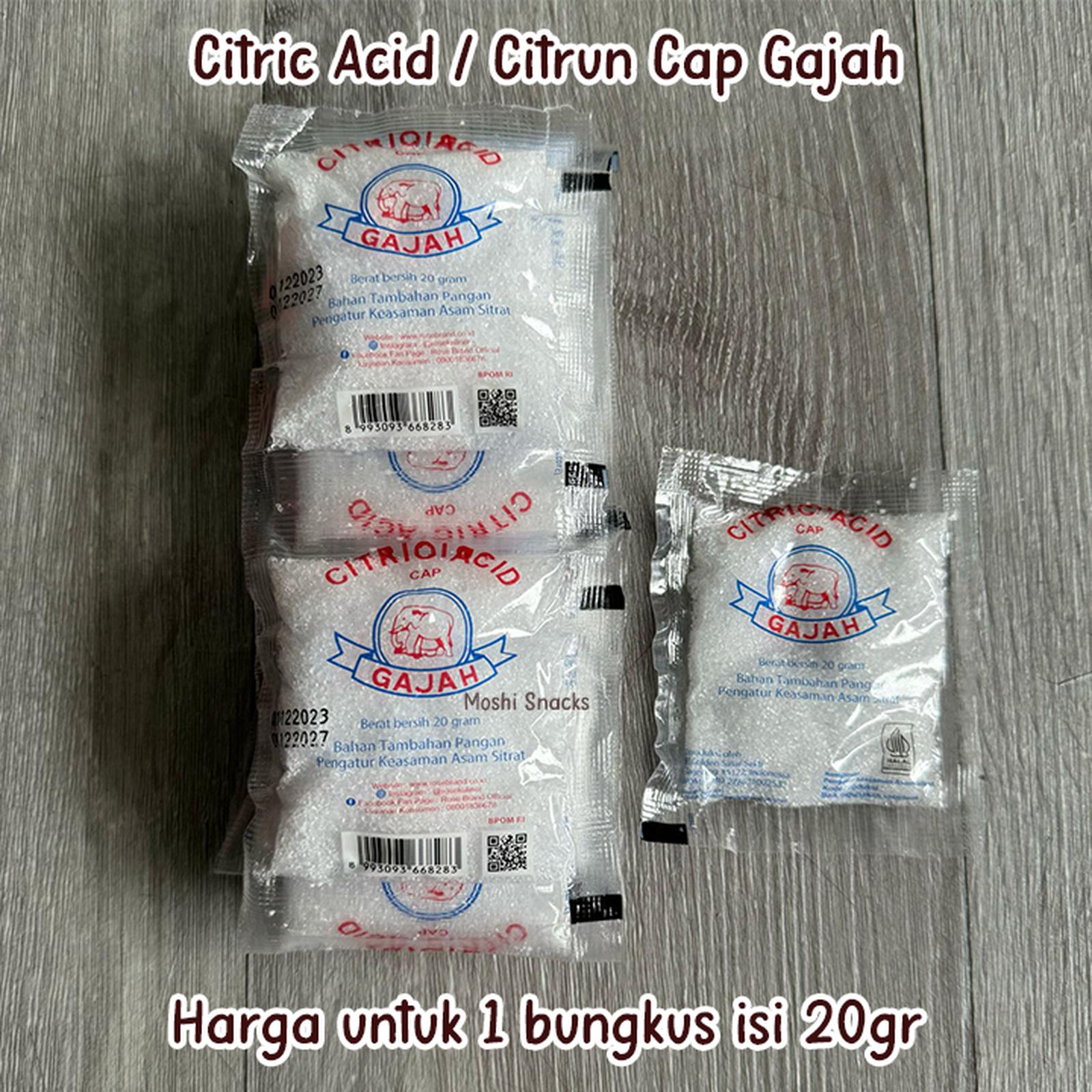 Dapatkan kemasan praktis Sitrun Cap Gajah untuk segala kebutuhan rumah tangga Anda. Tersedia dalam dua pilihan ukuran: 20gr dan 50gr. Produk ini merupakan Citric Acid Food Grade (Asam Sitrat Pangan) murni berbentuk kristal putih halus, sangat mudah larut dan memberikan rasa asam yang tajam dan alami.