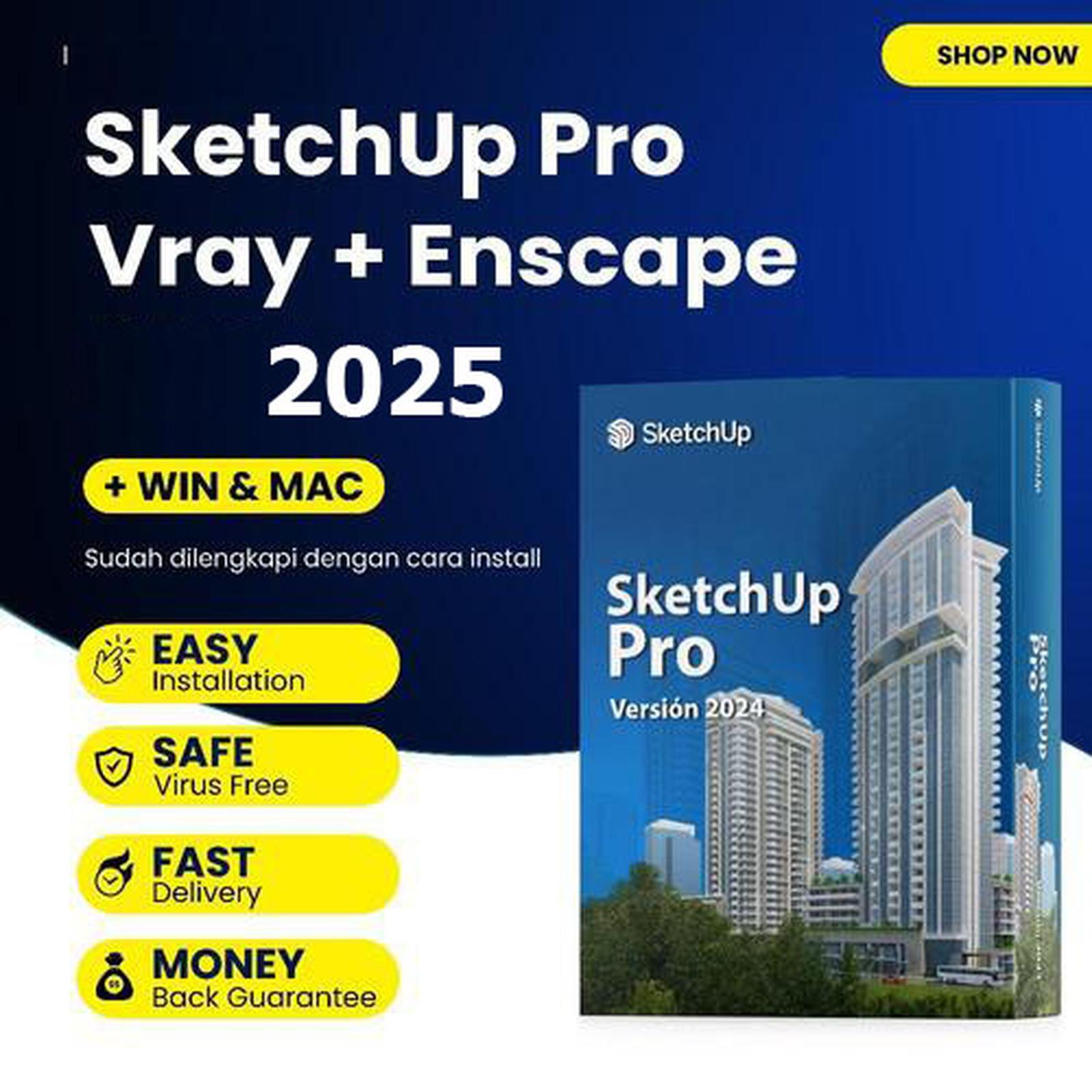 Dapatkan kemudahan dan kelengkapan dalam mendesain dengan SketchUp Pro 2024 terbaru yang sudah termasuk plugin render V-Ray dan Enscape. Paket ini merupakan versi lengkap (full version) yang kompatibel dengan sistem operasi Windows 10, Windows 11, dan macOS. Tersedia juga berbagai versi tahunan dari 2016 hingga 2025 untuk memenuhi kebutuhan spesifik proyek Anda.