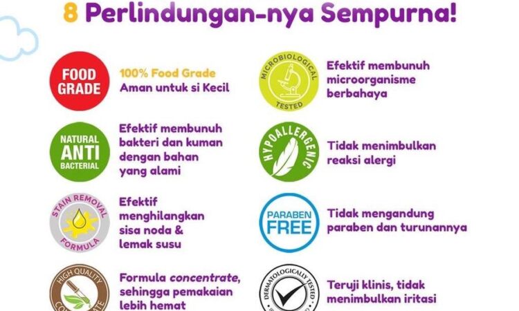 - Formula 8 Perlindungan: Kombinasi 8 zat aktif yang bekerja optimal membersihkan, menghilangkan bakteri, dan menjamin keamanan peralatan bayi.