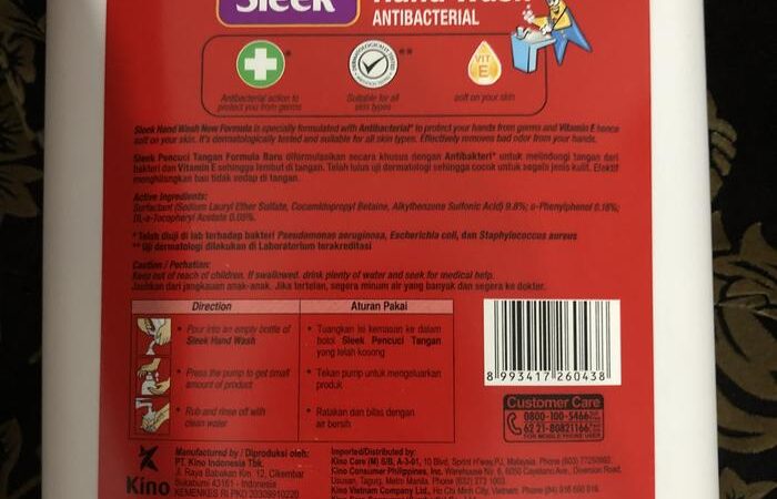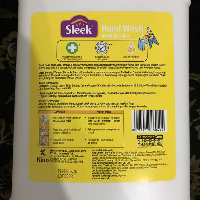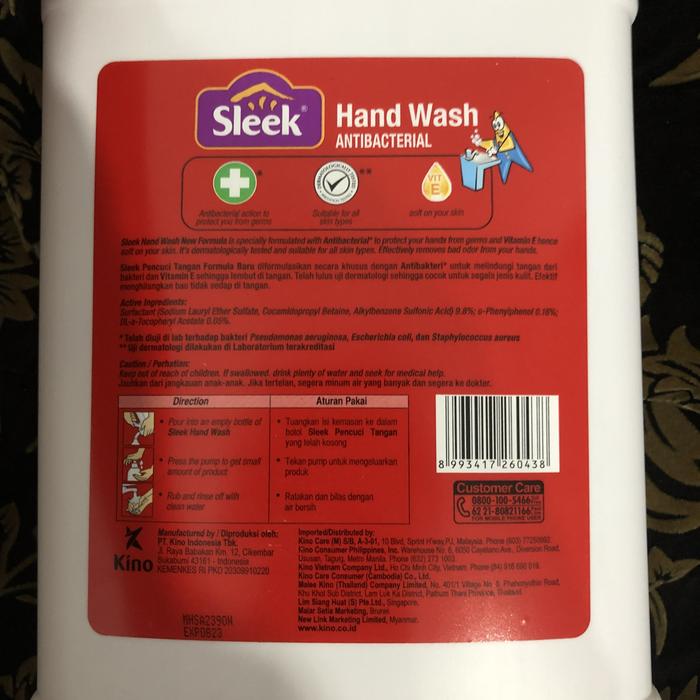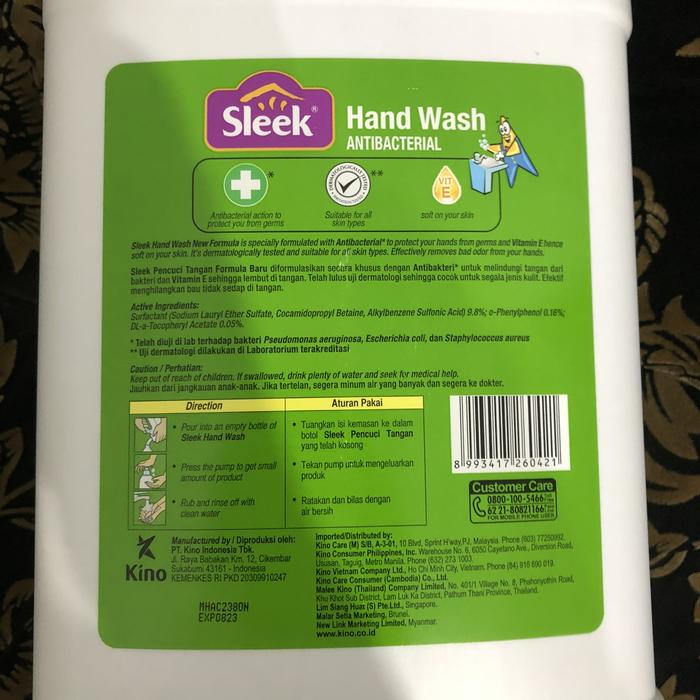 Formulasi baru Sleek Hand Wash menggabungkan kekuatan antibakteri untuk membasmi kuman dengan kelembapan Vitamin E yang menjaga kulit tangan tetap lembut dan tidak kering. Telah lulus uji dermatologi sehingga aman dan cocok untuk segala jenis kulit, bahkan yang sensitif sekalipun. Efektif membersihkan kotoran yang membandel serta menghilangkan bau tidak sedap seperti bawang, ikan, atau minyak goreng dengan wangi buah segar yang menyegarkan.
