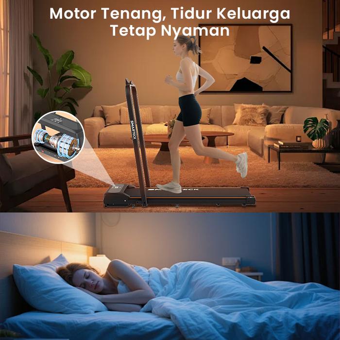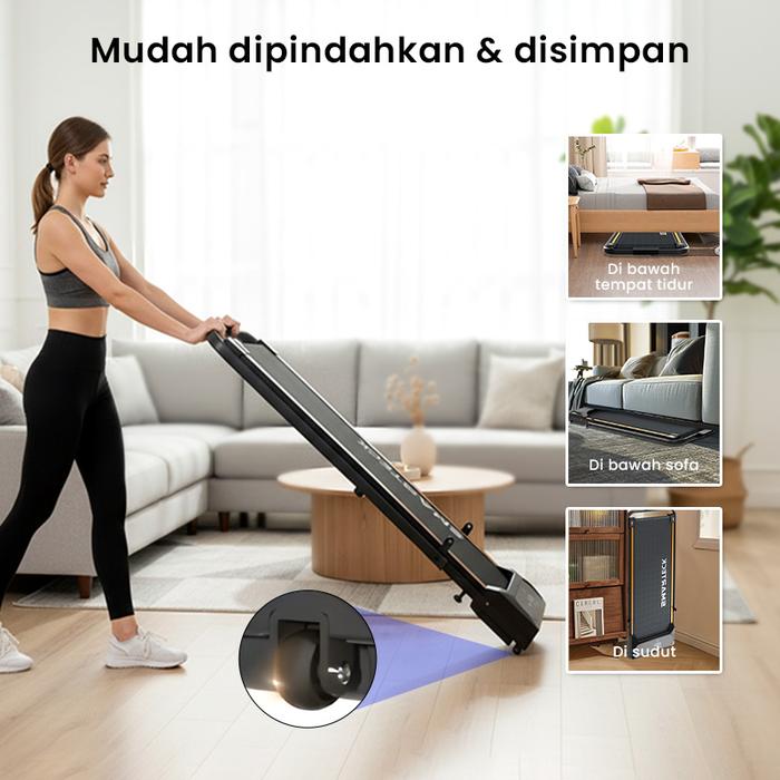 Desainnya yang compact (1200x540x1050mm) dan dapat dilipat membuatnya sangat ideal untuk ruangan kecil. Setelah digunakan, simpan dengan mudah di bawah sofa atau sudut ruangan tanpa memakan tempat. Area lari (1040x390mm) cukup luas untuk langkah yang nyaman, didukung oleh sistem ultra-quiet sehingga tidak mengganggu keluarga atau tetangga. Panel display menampilkan progress latihan Anda secara real-time, termasuk kecepatan, jarak, waktu, dan estimasi kalori yang terbakar.