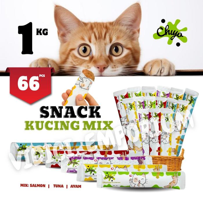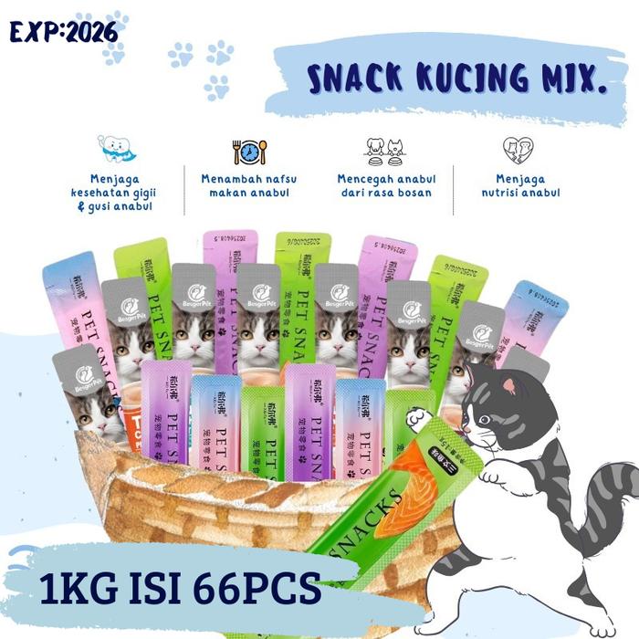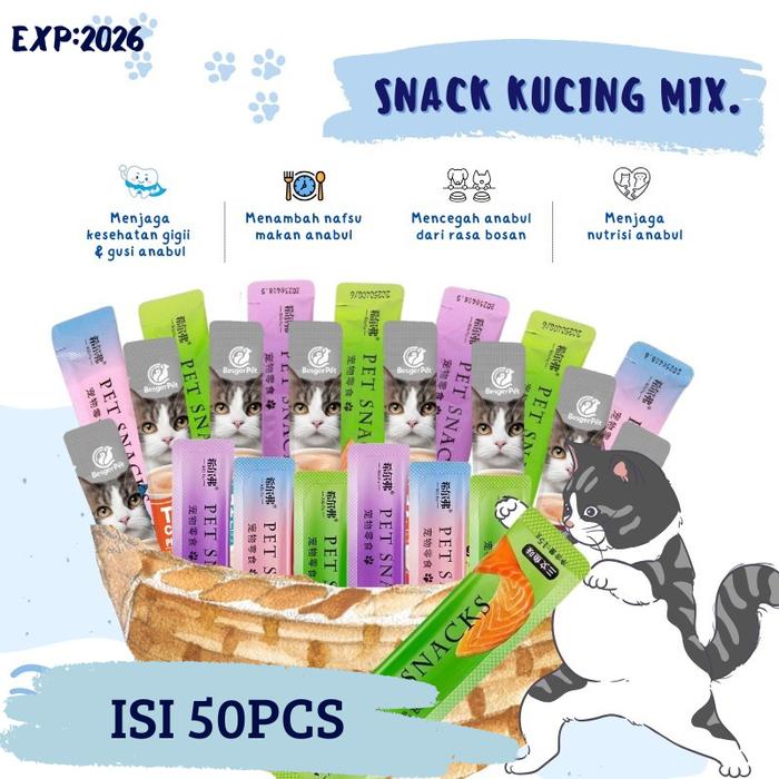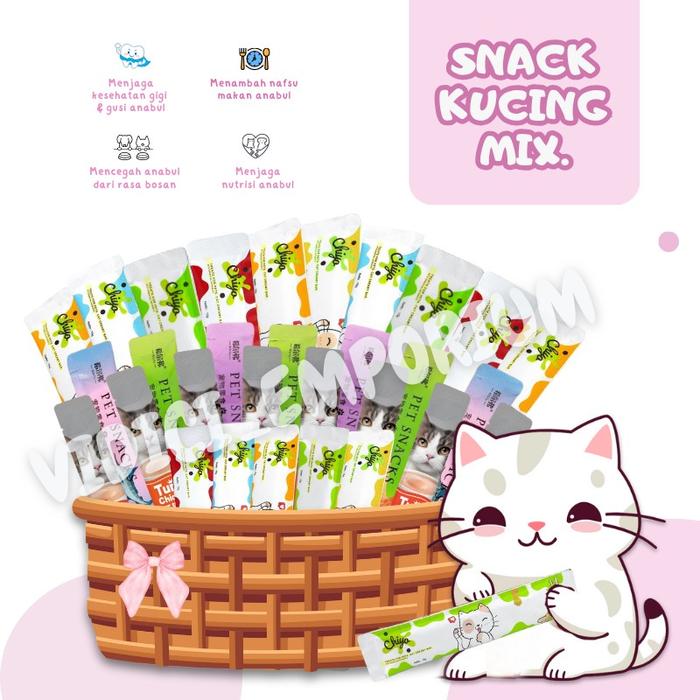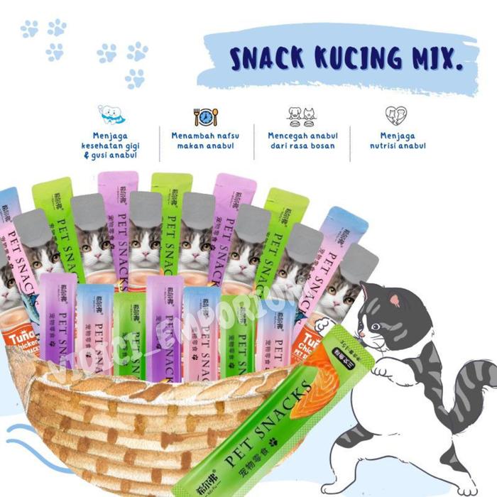 Berikan yang terbaik untuk anabul Anda dengan Snack Kucing Campuran Rasa premium kami. Terbuat dari 100% daging asli pilihan (Ayam, Salmon, Tuna, Ikan Cod) tanpa bahan pengawet berbahaya. Snack ini sangat disukai kucing karena aroma dan rasanya yang autentik.