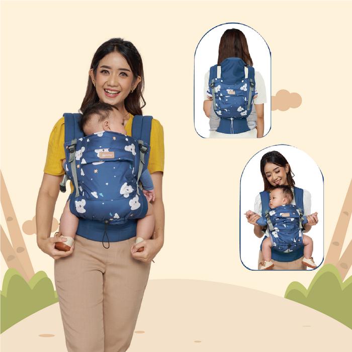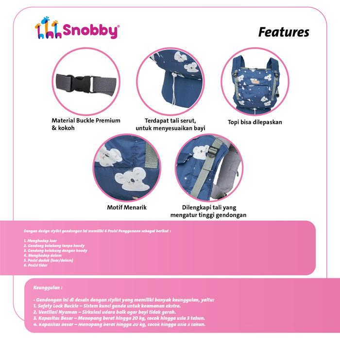 | Fitur Keunggulan | Tali serut penyesuai ukuran bayi, Tali pengatur tinggi gendongan, Tali pinggang berkunci sodok yang kuat, serta Hood/topi yang dapat dilepas. |