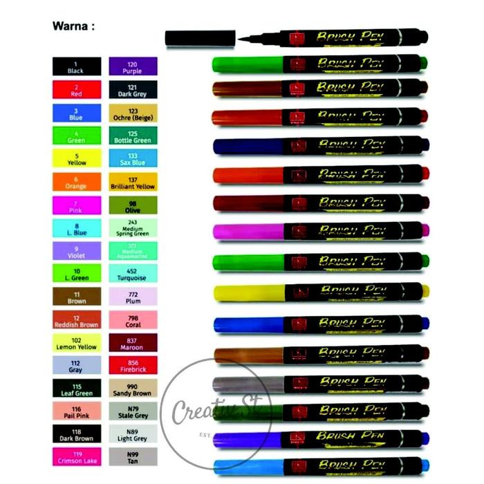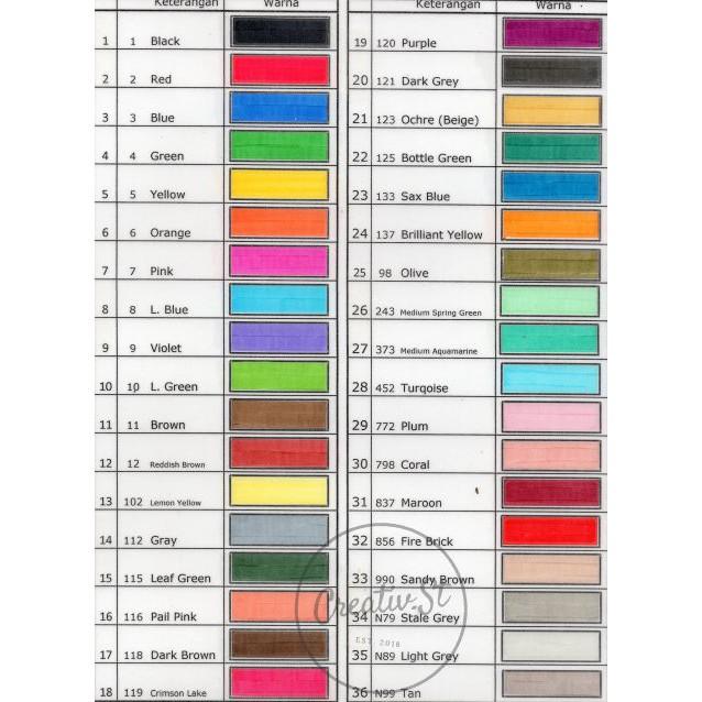 Pena ini hadir dalam 36 warna eksklusif yang spektakuler, dari warna-warna dasar hingga warna khusus yang unik. Setiap warna memiliki kode khusus untuk memastikan akurasi. Kami sangat menyarankan untuk memilih warna berdasarkan kode yang tertera pada tabel, karena hasil foto dapat bervariasi akibat pencahayaan dan setting kamera.