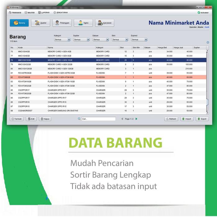| Data / Master | Kelola data Barang, Suplier, Pelanggan, Sales, Karyawan, Stok Opname, dan Kartu Stok dengan terstruktur. |