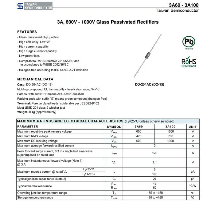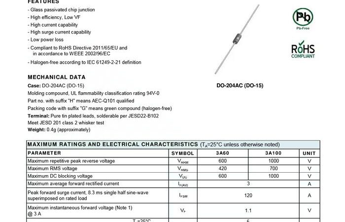 Produk 1N5404 hadir dengan keunggulan fitur fast switching untuk efisiensi tinggi dan tahan terhadap lonjakan arus hingga 50A. Sementara varian 3A60 merupakan produk original dari Taiwan Semiconductor yang dikemas dalam reel, menjamin kualitas dan konsistensi yang superior. Fitur unggulannya meliputi glass passivated junction untuk keandalan tinggi, low forward voltage, dan kemampuan menangani arus lonjakan yang besar, sehingga sangat ideal untuk aplikasi yang membutuhkan durabilitas ekstra.