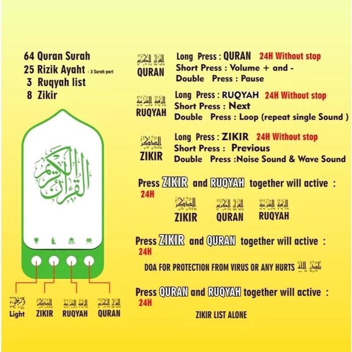 🔹 Tombol 2 & 3: Ganti bacaan (Quran Surah, Rizik Ayaht, Ruqyah, Zikir)