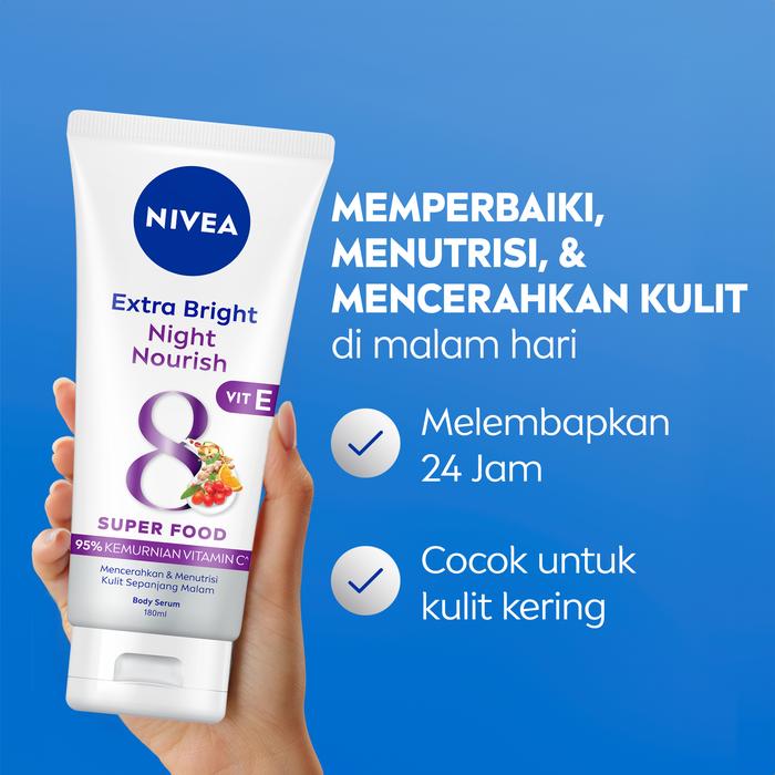 | 1 x NIVEA Extra Night Nourish Serum 180ml | Memperbaiki & mengembalikan kelembaban kulit saat malam, menutrisi hingga lapisan terdalam | Pro-Vitamin B5, Luminescent Brighteners |