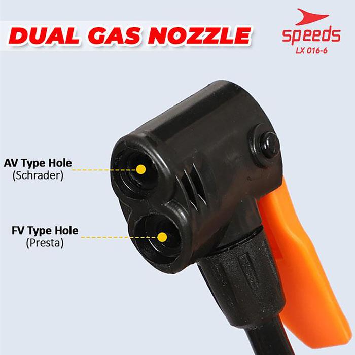 | Multiple Nozzle: Mendukung dua tipe kepala pentil (Presta dan Schrader), sehingga kompatibel dengan berbagai jenis ban dan bola. |