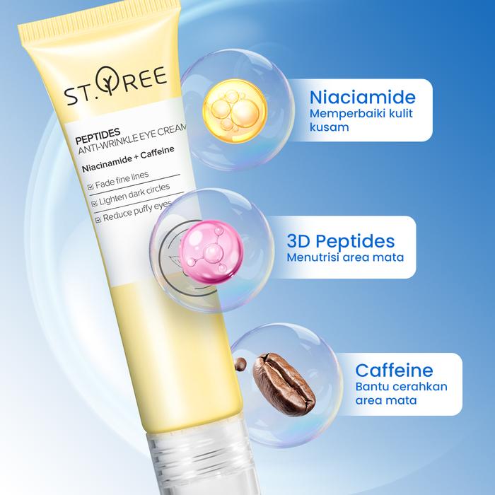 Rahasia mata yang tampak awet muda dan berenergi ada di ujung jari Anda! ST.TREE Eye Cream diformulasikan dengan Multi-Peptide Complex dan dilengkapi 3D Roller Massager yang memberikan sensasi pendingin instan untuk mengatasi berbagai permasalahan mata secara optimal.