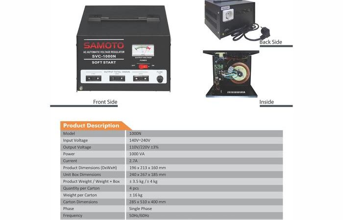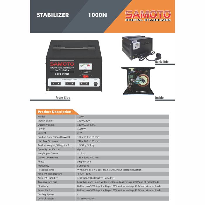 Lindungi peralatan elektronik Anda dari kerusakan akibat tegangan listrik yang tidak stabil, seperti lampu yang berkedip, kulkas yang tidak dingin optimal, kompresor berisik, atau TV yang rusak. Stabilizer Samoto 1000VA hadir dengan teknologi terkini untuk memberikan perlindungan terbaik.
