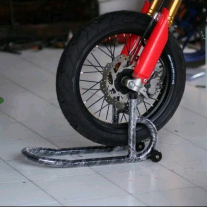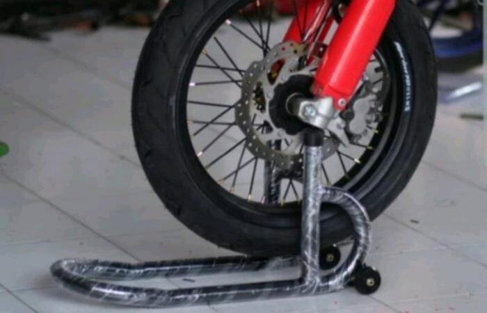 Fungsi utamanya adalah untuk mengangkat ban depan motor dengan aman dan mudah. Ini sangat berguna untuk berbagai aktivitas perawatan, seperti mencuci ban secara menyeluruh, melakukan pemeriksaan rantai, hingga mengganti ban dan velg. Proses perbaikan jadi lebih efisien, nyaman, dan bebas repot.