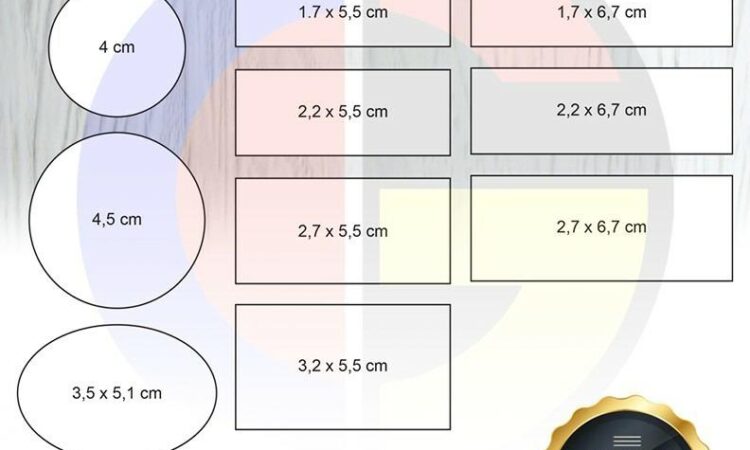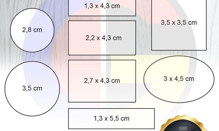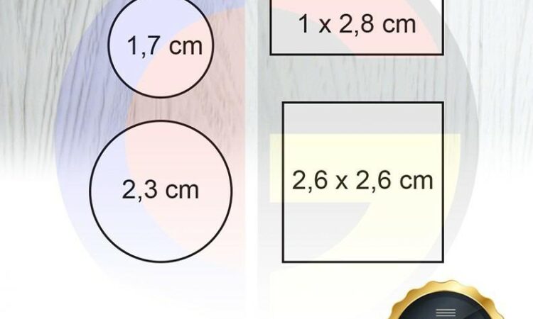 | Standar | Bulat: 2,8 cm, 3,5 cm Persegi Panjang: 1,3 x 4,3 cm, 2,7 x 4,3 cm Kotak: 3,5 x 3,5 cm Oval: 3 x 4,5 cm |
