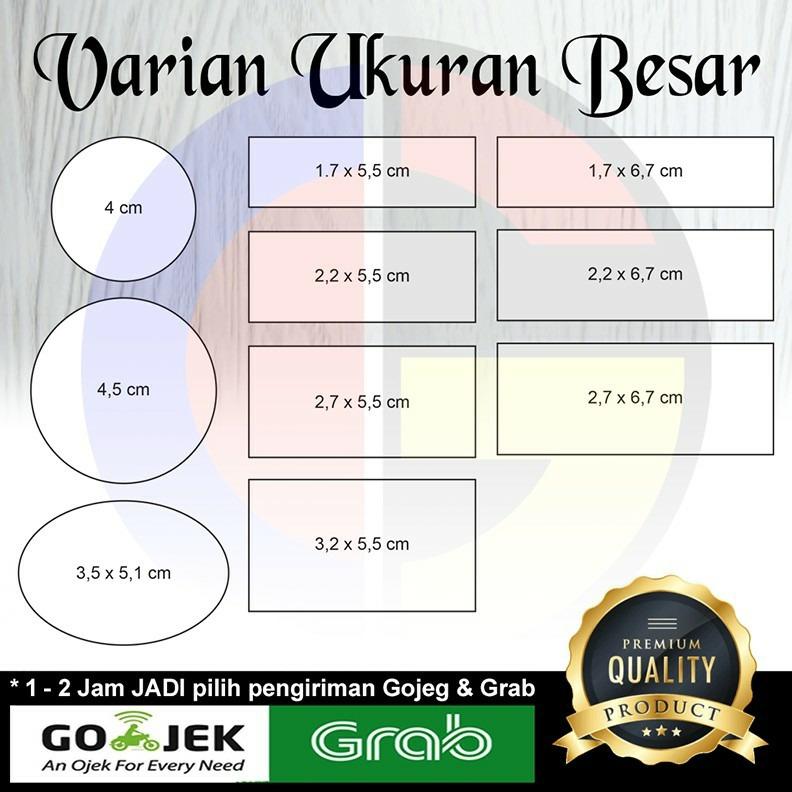 | Besar | Bulat: 4 cm, 4,5 cm Persegi Panjang: 3,2 x 5,5 cm, 2,7 x 6,7 cm Oval: 3,5 x 5,1 cm |