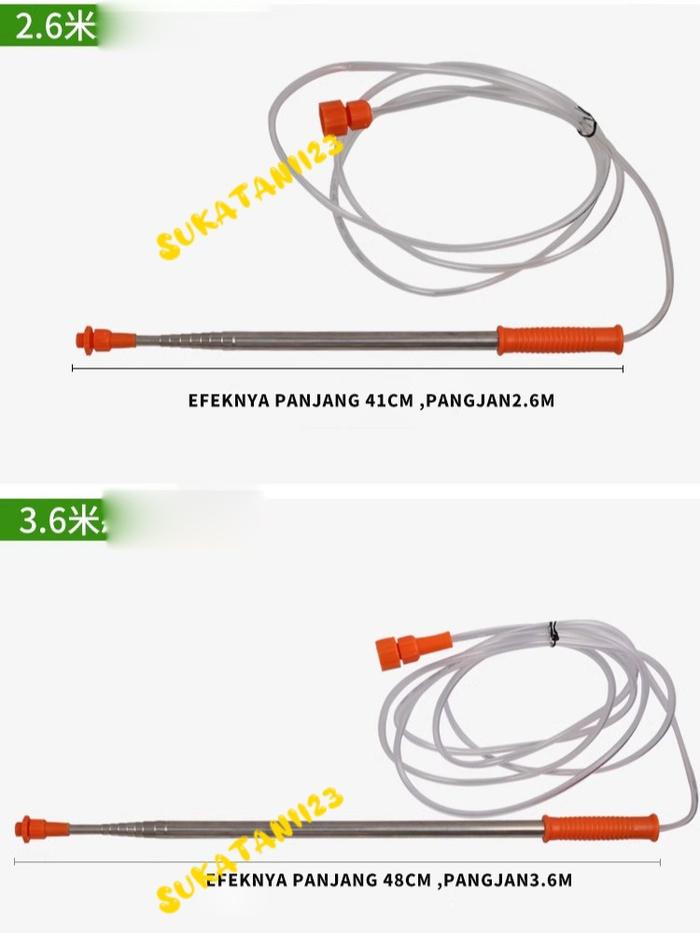 Dengan fitur teleskopik, stik ini sangat praktis. Simpan dalam ukuran compact 60 cm untuk memudahkan penyimpanan dan transportasi, lalu panjangkan hingga 3.6 meter saat akan digunakan untuk menjangkau atap, pohon tinggi, atau area luas lainnya tanpa需要使用 tangga. Bahan pipa stainless steel menjamin durabilitas dan ketahanan terhadap korosi dari cairan kimia pertanian.